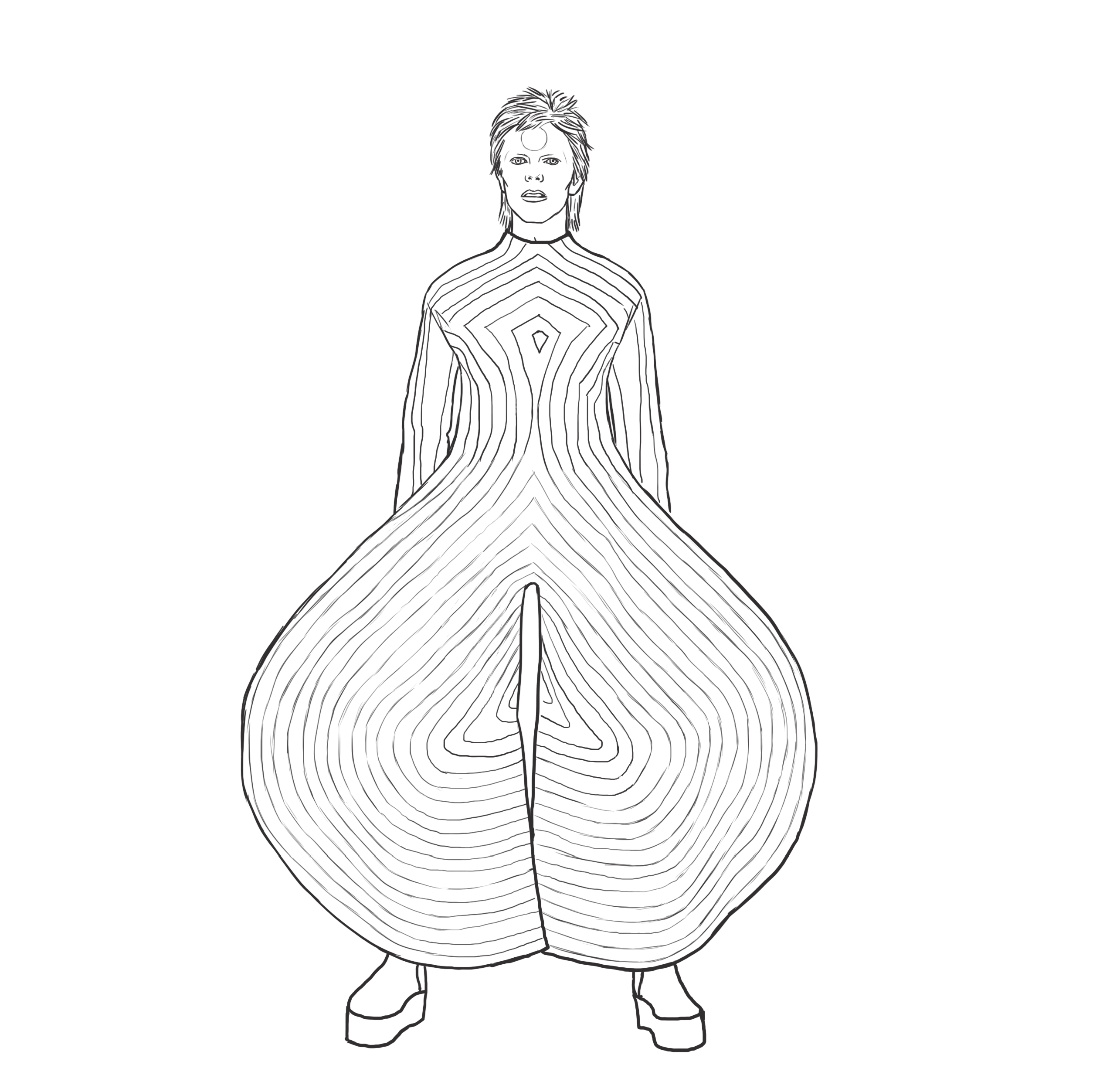 Here’s a small selection of some of the 30 black and white illustrations from the book, showing the full range of David Bowie’s idiosyncratic and indelible looks throughout the years for you to download and colour in at your pleasure.